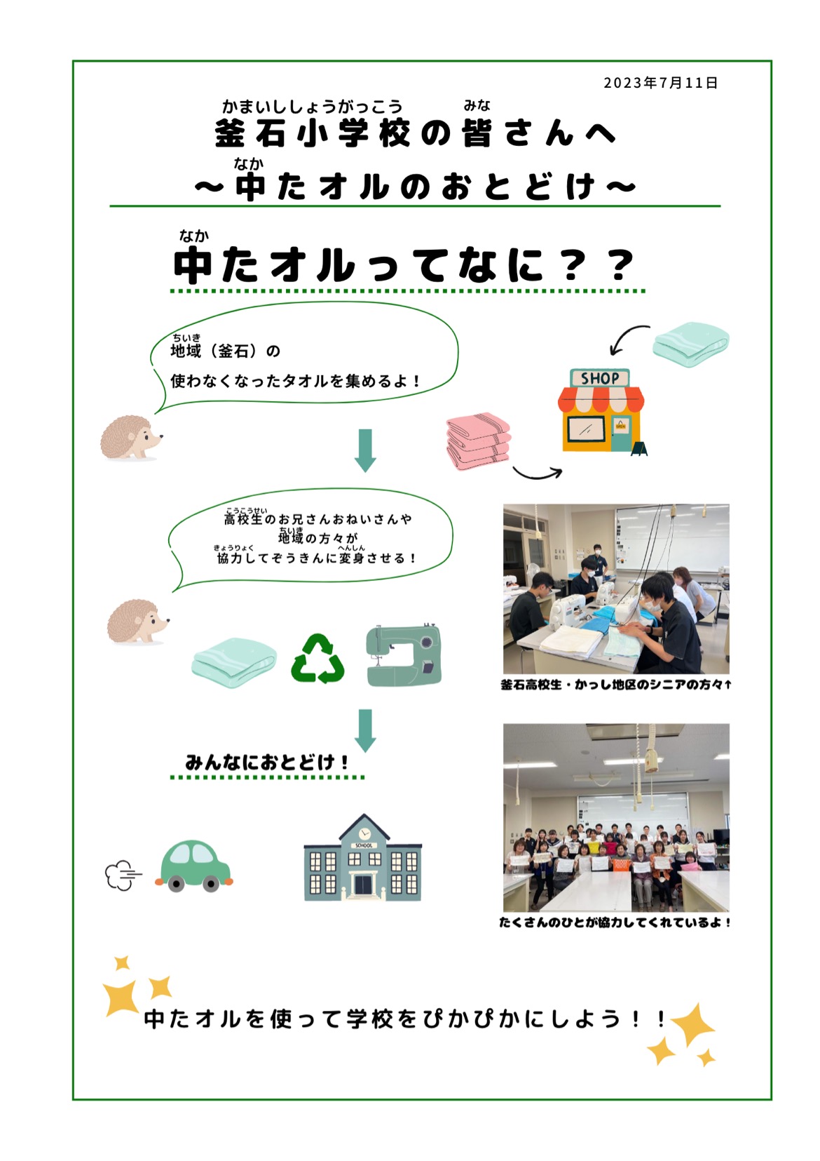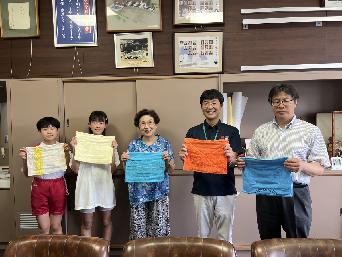 7月11日(火)釜石小学校を訪問し、シニア代表(甲子地区パッチワークサークルひまわり会会長)坂本慶子さんと弊社の中田社長より、187枚の中たオルを児童代表に寄贈しました。今回は都合により高校生は参加できませんでしたが、元インターン生が作成した小学生向けの説明書を一緒に渡しました。
