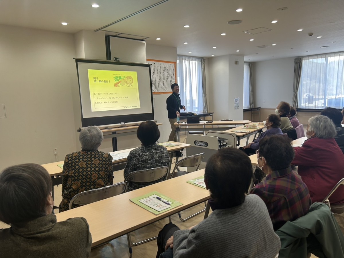 2月19日(水)唐丹スクラムメイトの会に出向き、お薬相談会を開催いたした。弊社の中田義仁が釜石薬剤師会の講師を務め、15名の方に約1時間お話をいたしました。中田「唐丹スクラムメイトでは普段から週に一度集まり運動をはじめとした活動を行っており、元気なはつらつとした方が多い印象でした。薬に関する質問も多く出され、間に雑談をはさみながら楽しくお話しさせていただきました。高齢者の皆さんが日頃から積極的にコミュニティーに参加し顔の見える関係を作ること、人と会話すること、体を動かすことは薬以上に健康寿命を延ばすことに効果があると実感しました。」