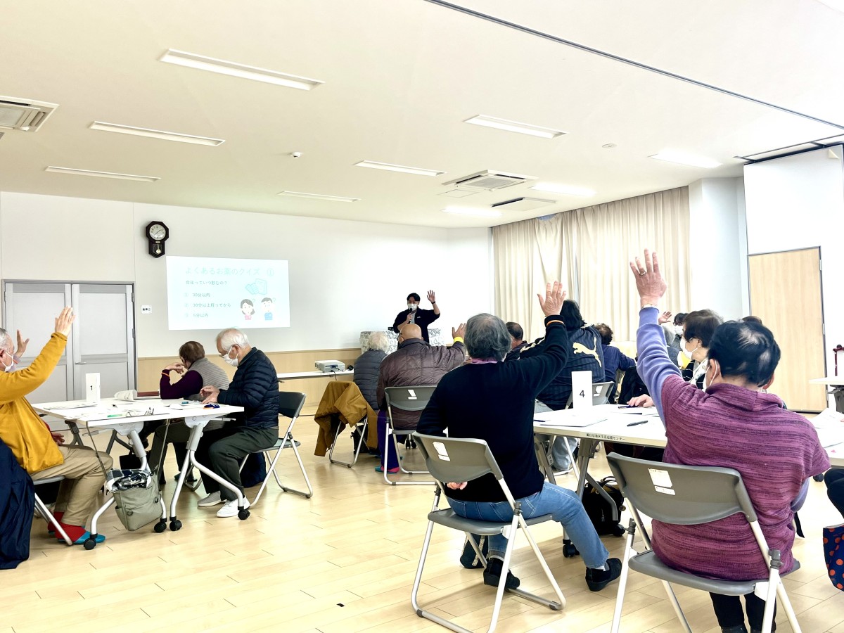 1月月22日日(木)、鵜住居地区生活応援センターにて開催された第2回 チームオレンジ・はまぼうふう「あつまろう会」において、「認知症とお薬」をテーマに、釜石薬剤師会として松倉店の大釋 瞬 薬局長が講話を行いました。「チームオレンジ・はまぼうふう」は、認知症のある方やそのご家族を、地域全体で支えていくことを目的としたボランティア団体です。当日の講話では、「認知症とお薬」をテーマに、服薬管理の工夫や注意点について、実際の症例を交えながら分かりやすく説明しました。薬の一包化(朝・昼・夜など、同じ時間に飲むお薬を1つの袋にまとめること)や服薬支援の方法など、日常生活にすぐに活かせる内容が中心となりました。 講話後にはグループワークが行われ、参加者同士で意見交換を行いました。日頃から地域での見守りや助け合いを大切にされている皆さんということもあり、多くの質問や活発な意見が寄せられましたので、その中のいくつかをご紹介します。 「薬の一包化など、便利な方法を知ることができ、周りで困っている人がいたら教えてあげたいと思いました。」「一人暮らしだけでなく、家族と同居していても孤立している方が多く、より一層気にかけることが大切だと感じました。」 大釋薬局長は、 「意識の高い皆さんが集まっていたため、普段のお薬説明会より一歩踏み込んだ内容としました。予想以上に多くの質問があり、地域の皆さんの関心と意識の高さを改めて実感しました。今後も、薬剤師会・行政・地域の皆さんが連携を深めながら、認知症支援に取り組んでいきたいと思います。」 と話しました。今後も地域と連携し、認知症のある方やそのご家族が安心して暮らせるまちづくりに貢献してまいります。